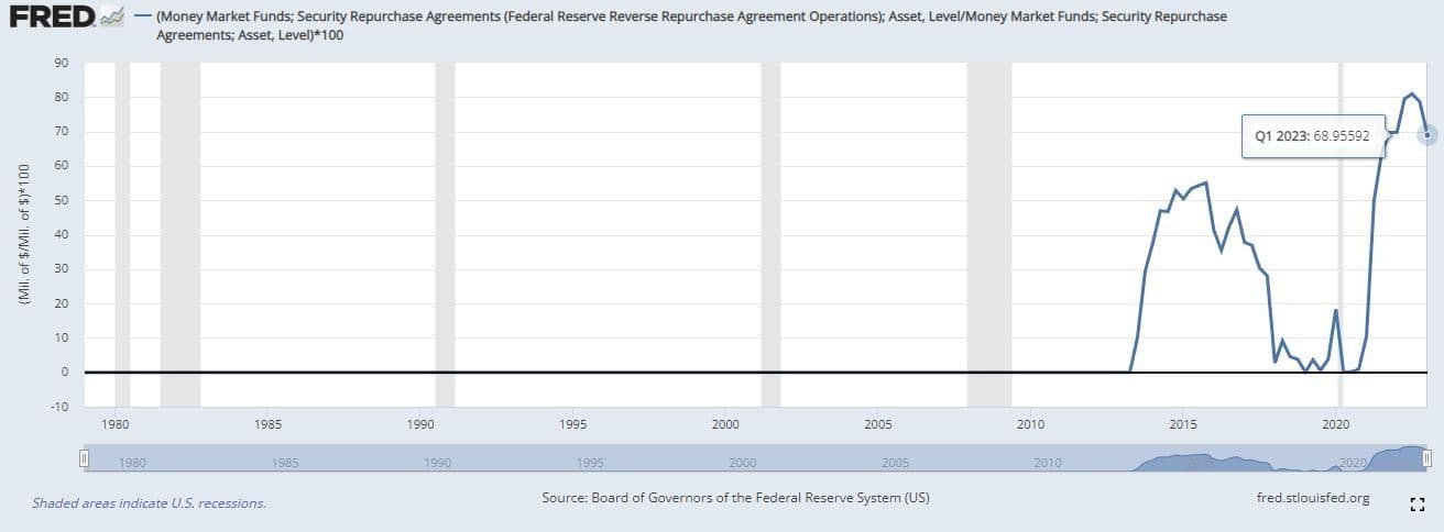 Historically, an average of 20-30% of MMF repo allocations involved the Federal Reserve. As of Q1 2023, this figure stands at around 70%. This interconnection ties everything together, and by understanding the aforementioned context, we can comprehend the following events.