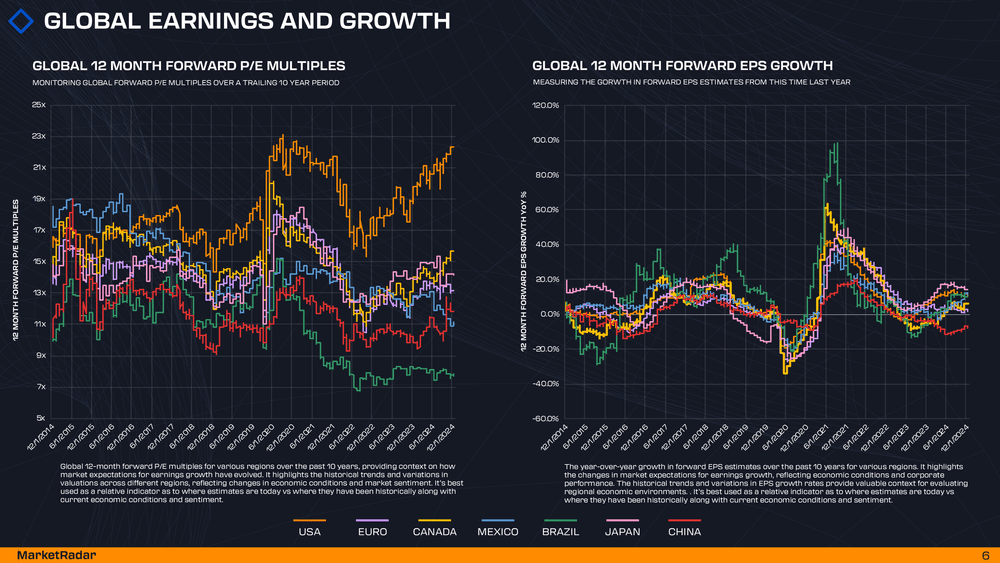 Let’s begin with an analysis of global forward price-to-earnings (P/E) estimates. As we head into the end of the year, in the United States, forward P/E estimates are currently at or near the peak levels we saw in 2021—a period characterized by a ZIRP (zero interest rate policy) environment. While I wouldn’t outright dismiss these multiples as expensive, the current setup leaves us with three potential paths forward: