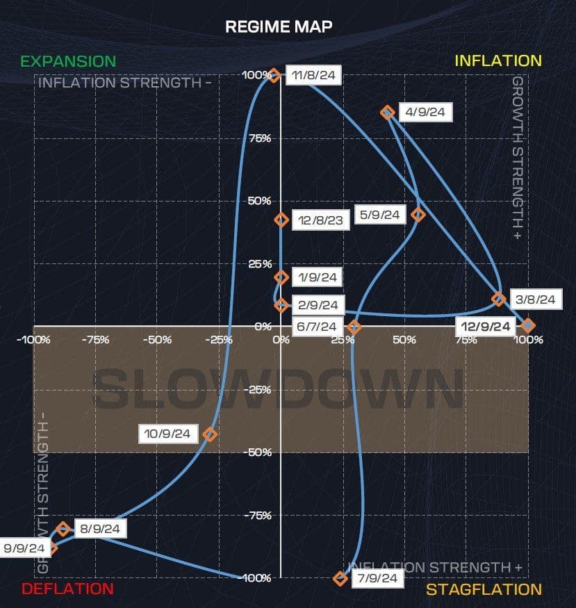 To clarify: the term “Inflation regime” often carries an alarmist undertone, but history shows these regimes aren’t necessarily synonymous with runaway inflation. For example, we’ve seen Inflation regimes in the past decade with CPI levels comfortably under 3%. The System could simply be identifying a slowdown in disinflationary momentum—less “inflation ripping,” and more of a pause in downward pricing pressures. However, a more compelling shift in disinflationary forces would require stronger signals, such as $GSG entering a bullish trend. Remember, an Inflation regime is very bullish for risk assets. However, a Stagflation regime is quite the opposite.