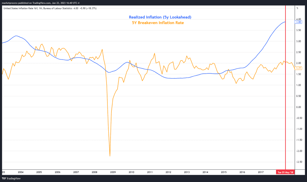 Right off the bat, you'll notice that there isn't a ton of data to analyze. If we want to examine the realized rolling 5-year inflation rates, the most recent 5-year average from today would be 2018 (2023-5). Keep in mind that 5-year TIPS trading only started in the early 2000s, which means we only have about 15 years of market data to work with.
