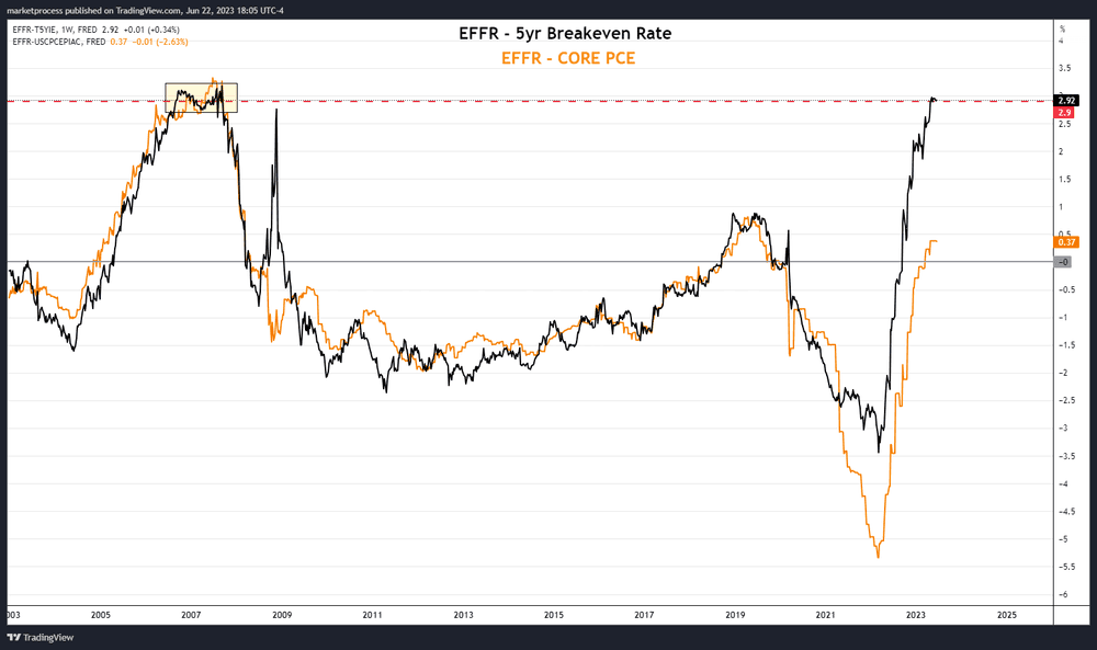 The calculation mentioned above assumes that the market actually cares about the Real Fed Funds Rate. But the truth is, this rate is somewhat outdated because it relies on past data rather than considering current policy and forward expectations, which are the real driving forces behind market behavior. Ideally, inflation shouldn't swing wildly, so there should be little difference between these two calculations in terms of where inflation stands and where it's expected to go, especially when we're hovering around the Fed's 2% target.