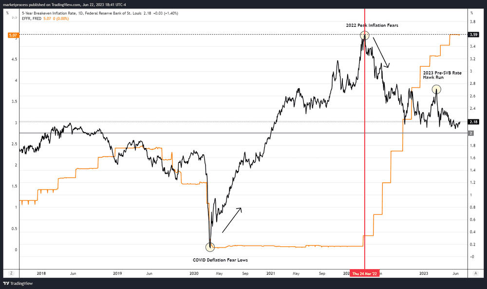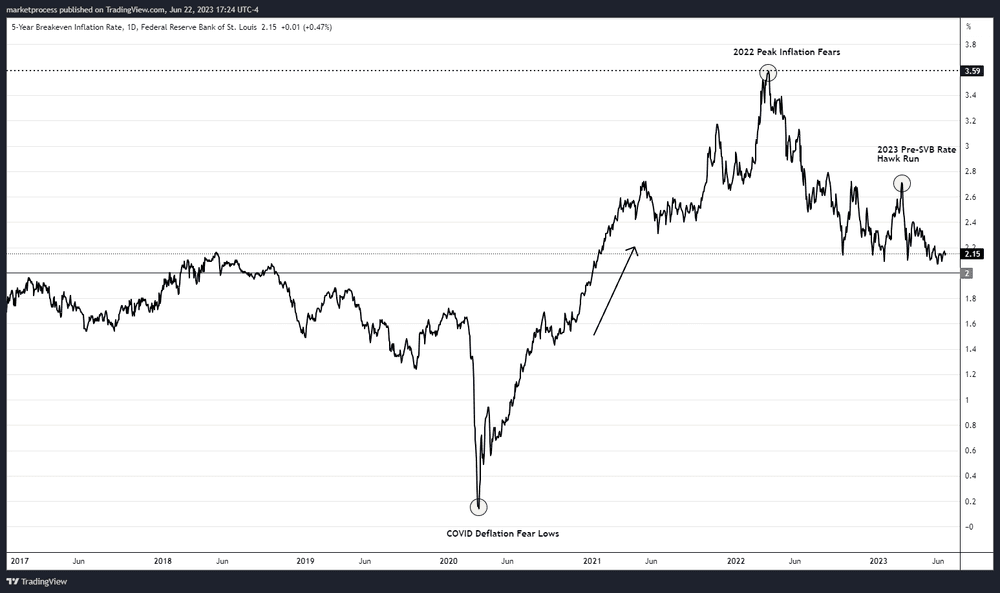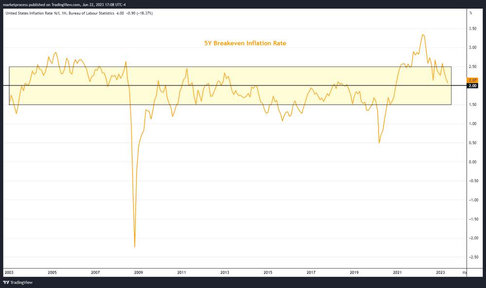 Powell has repeatedly mentioned that "inflation expectations remain well anchored," referring to the market's perception that the Fed is effectively managing inflation. This indicates that the Fed's actions and policies are instilling confidence in the market, allowing inflation expectations to remain steady. While breakevens may not be foolproof in predicting future inflation, they offer valuable real-time information and serve as a gauge of market sentiment regarding the Fed's ability to control inflation.