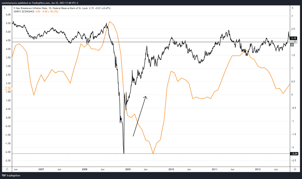 It's highly likely that inflation expectations will eventually dip below 2%, most likely during a recession. Looking at the chart provided, it's clear that current inflation conditions play a major role in shaping the outlook for inflation expectations. A striking example is seen in 2008 when breakevens reached their lowest point, forecasting an average inflation rate of -2.24% over 5 years! Little did they know back then about the colossal quantitative easing (QE) efforts that were about to be unleashed.