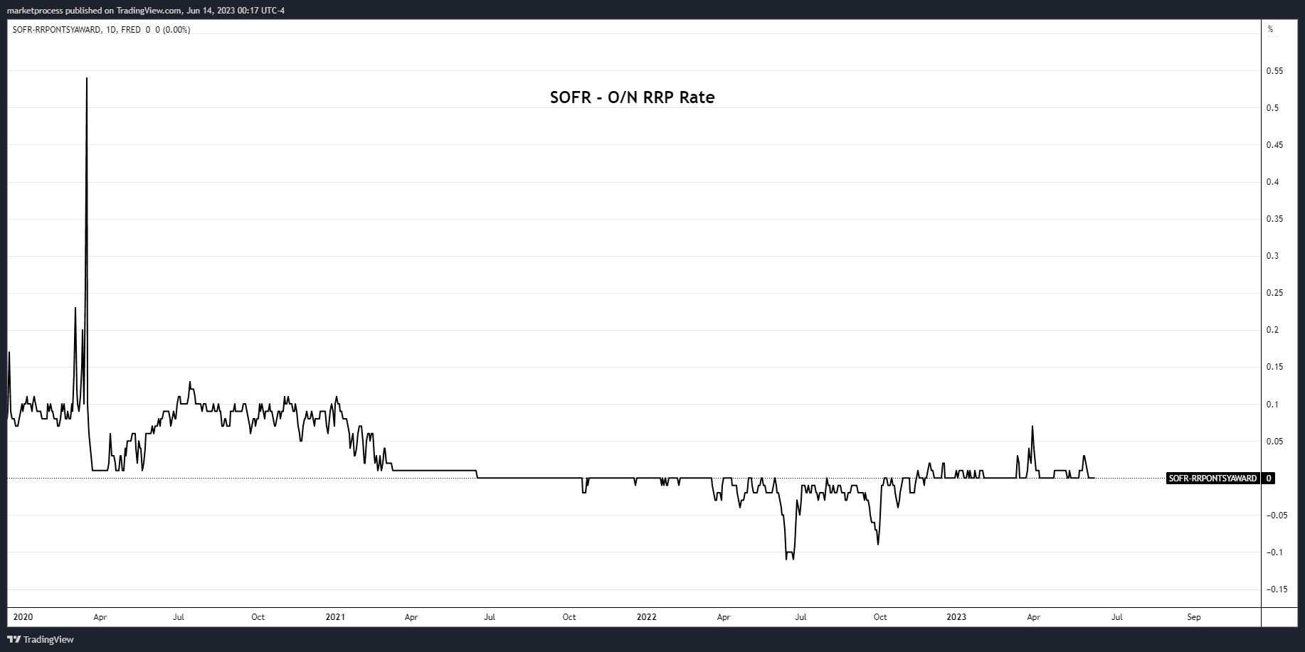 The SOFR rate can be considered the market-priced equivalent of the Fed's overnight reverse repo rate. By subtracting the overnight reverse repo rate from the SOFR rate, we can observe that for most of 2022, the spread was negative. This indicates that the private sector's ability to engage in repos and the supply of treasury bills were stretched to their limits in meeting the demands of the money market assets.