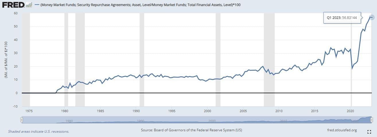 Understanding this is crucial because MMFs can act as Institution A, utilizing their excess cash to engage in repo operations. Historically, between 12-20% of all MMF assets were invested through the repo market. As of Q1 2023, this figure stands at 56%.