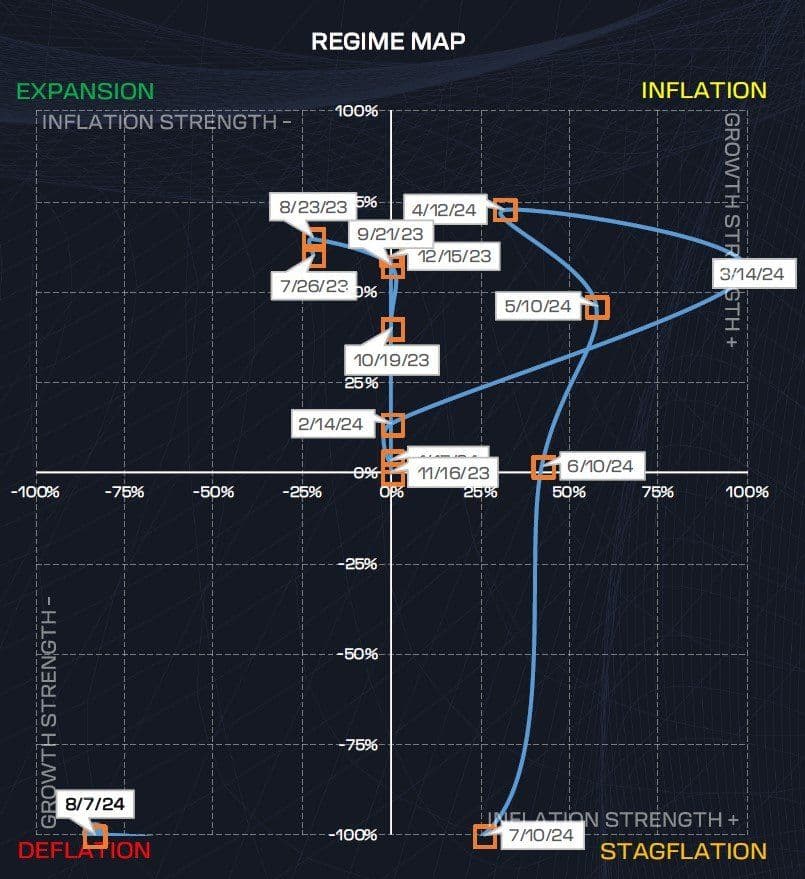 As we navigate the shifting tides of the financial markets, it's clear we're in the midst of a significant transition. Over the past month, our system has accurately called the move from Stagflation to a Deflation regime, signaling that a cautious approach is more important than ever. This shift, while not entirely surprising, highlights the challenges ahead, especially as we find ourselves firmly in a Risk-Off environment—a space where negative growth strength holds sway and the path to a more optimistic Risk-On scenario feels increasingly narrow. As we dig into our Compound Landing framework, we're at a pivotal moment. The economy has been adjusting to higher rates, but the big question on our minds is whether we can maintain this delicate balance or if we're on the brink of something more serious. In this piece, we'll explore what this means for bonds, equities, and our overall strategy, offering insights to help you navigate the complexities of the road ahead. Let's dive in together and make sense of these uncertain times.