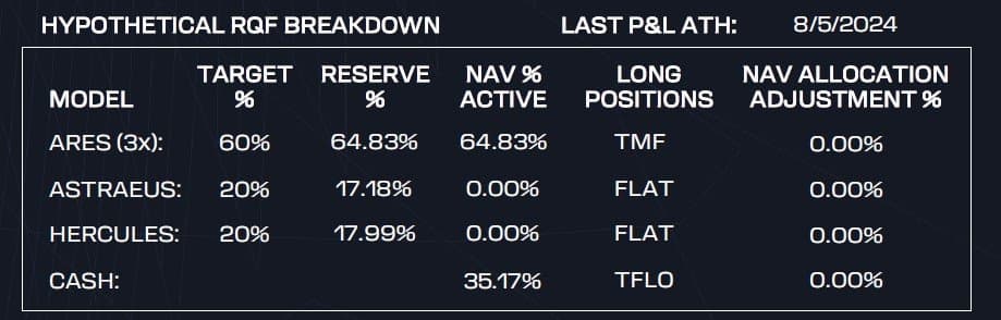 As of this week, the RQF has reached a new all-time high, with over a third of our net asset value currently held in cash. Both our short volatility and Bitcoin models (Hercules and Astraeus) are designed to be dynamic, and capable of opening positions even in Risk-Off regimes, though with smaller allocations. We're staying vigilant for any reversions in volatility or crypto that could present new opportunities. But for now, bonds are the name of the game.