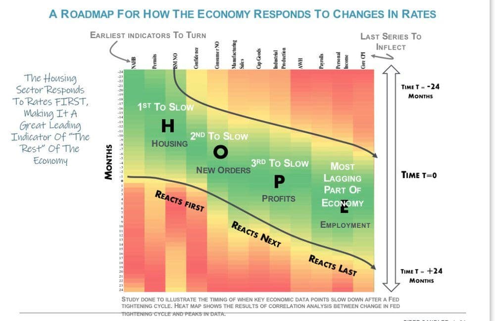 There has been a ton of research conducted on the policy lags of the Federal Reserve and typically a range between 18 to 24 months is seen as a referenced figure for the expected lag in tightening cycles. Michael Kantro, CIO at Piper Sandler, has a great framework for visualizing the shocks of a tightening cycle through different sectors of the economy.