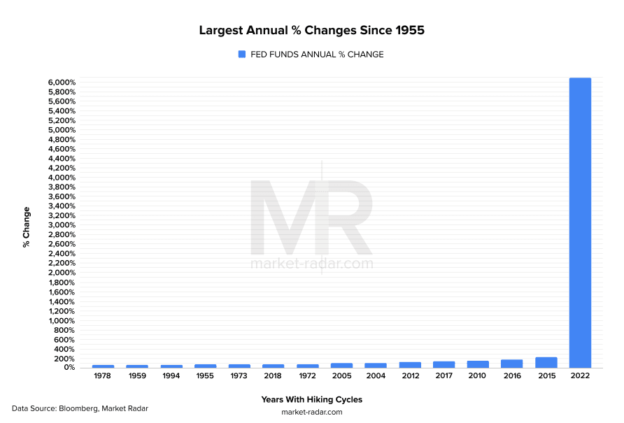 Not only is this hiking cycle titled the "fastest", but it's also titled the most "explosive" in the prior 50 years. On an annual rate of change basis, the Fed Funds Rate was lifted over 6,000% in 2022. The second on the list is not even close at 233% YoY in 2015!