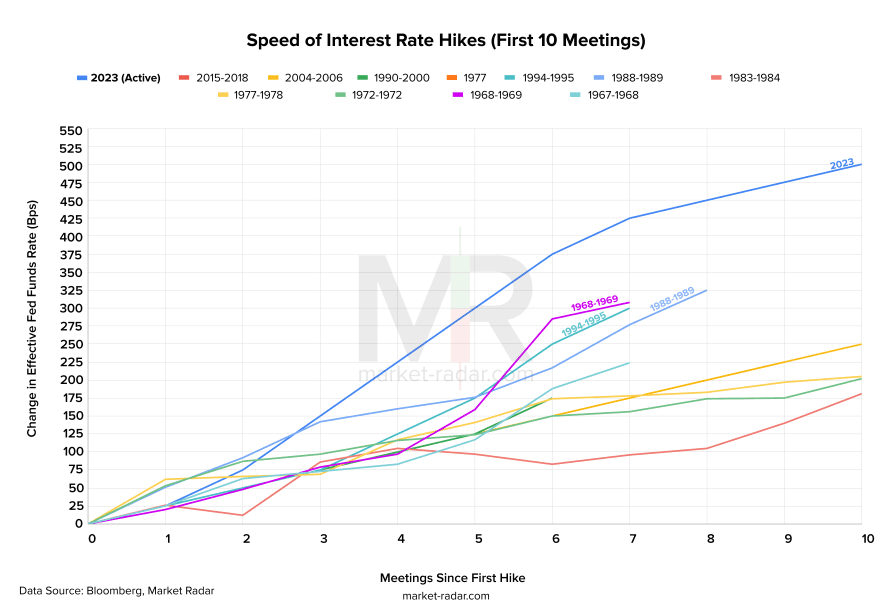 The current hiking cycle (2023) is the fastest in terms of percentage points added to the Federal Funds rate in the prior 50 years. It's commonly understood that the Fed was late to lift policy in 2022 and could have done so well into 2021. Nonetheless, it’s clear as day that once they lifted...they lifted firmly without messing around.