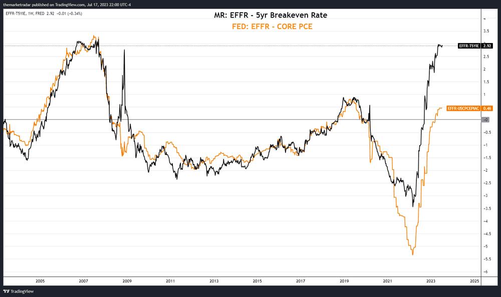 Regarding the Fed's fight against inflation, they have done a spectacular job, especially after letting it escalate between '21 and '22. As we explained earlier, the Fed is likely to overtighten either through nominal rates or relative rates, holding policy in a restrictive state for too long. You can find a better measure of "real Fed policy" than what the Fed provides HERE.