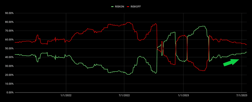 As you can observe, Risk-On has been slowly building in the past few months, despite Risk-Off dominating the scene. It's essential to pay attention to this, especially noting that the odds aren't that far off—we're basically at a coin-flip between Risk-Off and Risk-On!